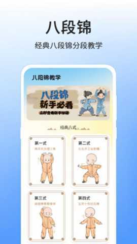 八段锦8式教程是一款专注于传统养生功法的移动软件,帮助用户掌握八段锦的完整练习体系,通过详细的动作分解、呼吸配合和练习要点说明,结合视频和图文解析,使练习者能够逐步掌握每一个动作的要领。用户在日常锻炼中,能够体验到身心的放松,还能有效改善健康状况。