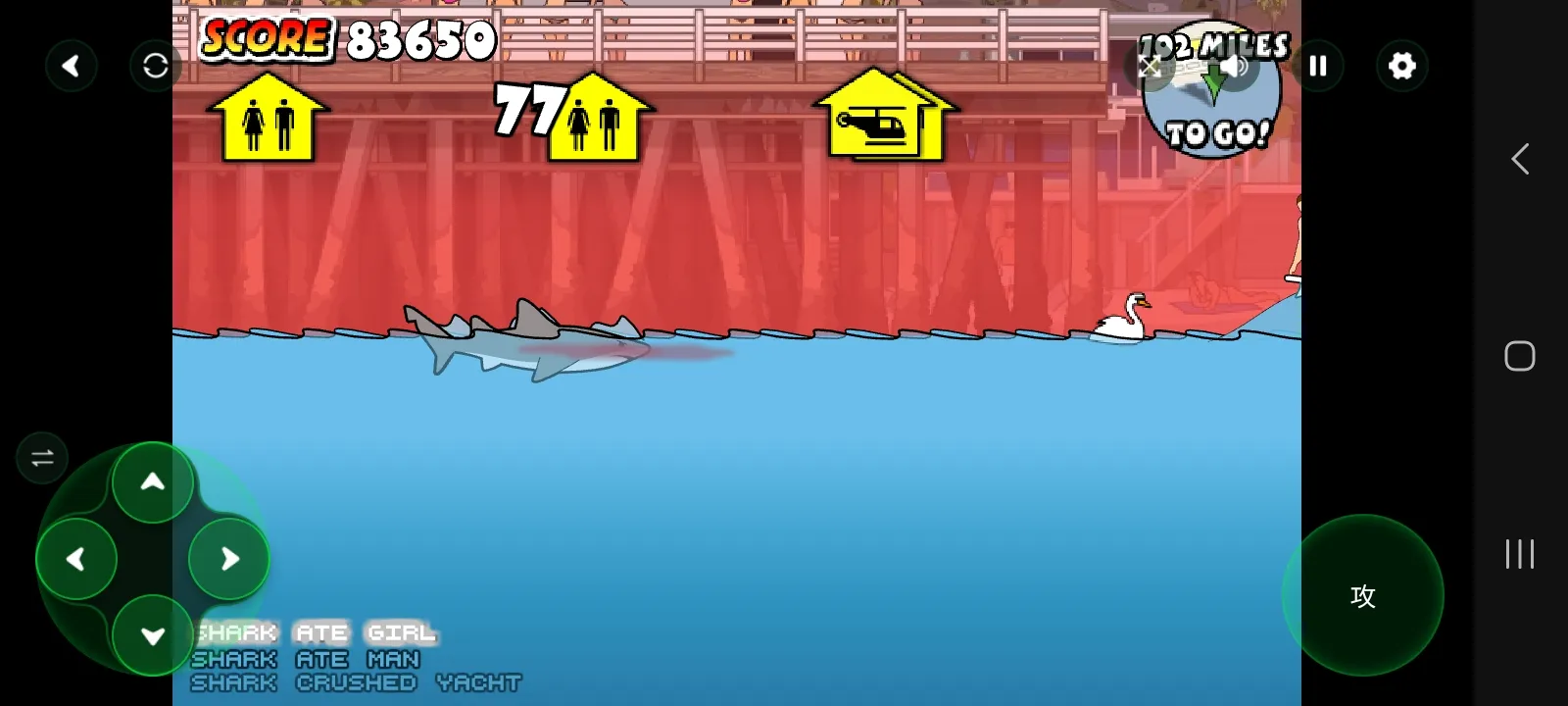 鲨鱼可以利用特殊的跳跃机制跃出水面,攻击空中目标。成功咬住目标后,可以通过连续的操作将其拖拽入海,产生连锁的爆炸效果,给人带来强烈的视觉冲击。