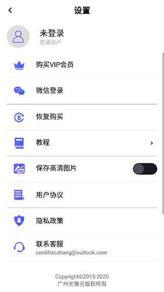 设置中包含购买会员、微信登录、恢复购买等功能,还可查看相关使用教程。