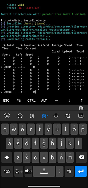 5、此处以大家用的最多的Ubuntu来演示,安装一个上面列出的ubuntu 22.04 (jammy)环境,使用proot-distro install ubuntu来安装,安装过程需要联网,耐心等待。