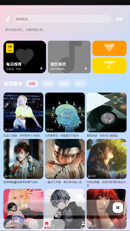 在主页上根据不同的分类,如新歌、热歌、抖音等,轻松浏览各类音乐,便于发现新的歌曲和艺术家。