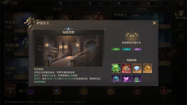护送公主至安全之地,不仅英雄气概尽显,更有巨额经验奖励等您来领!技巧1:选择红色公主,奖励瞬间飙升3倍!技巧2:紧盯时间表,每日16:05-16:35与21:30-22:00,双倍护送时段,奖励翻倍乐不停!