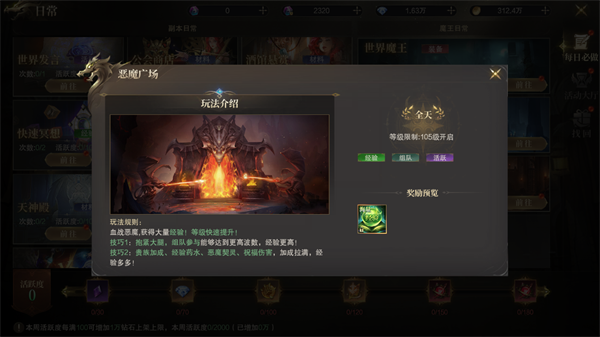 踏入恶魔广场,与恶魔激战,海量经验等您收割!技巧1:组队作战,抱紧大腿,挑战更高波数,经验满载而归!技巧2:贵族特权、经验药水、恶魔契灵、祝福伤害,全方位加成,经验收获最大化!