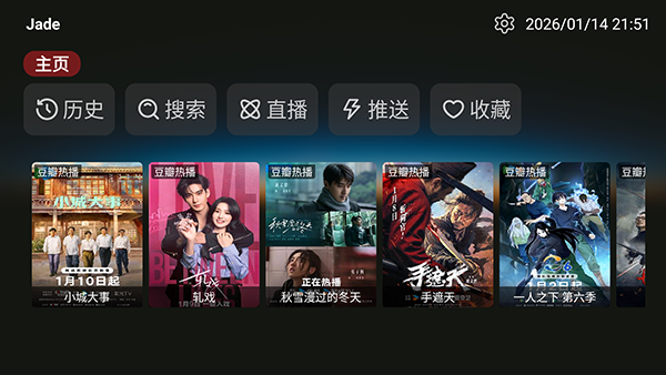 Jade拾光boxTV电视版是一款专注于家庭影音娱乐的智能电视软件,为用户提供高品质的观影体验,的设计理念围绕着简约界面、优质内容、流畅播放展开,聚合了丰富的正版影视资源和个性化的直播服务,力求为用户带来无广告干扰的观看体验。无论是想要欣赏最新的电影、热门剧集,还是享受经典综艺节目,Jade拾光都能满足您的需求。