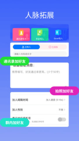 自动拓展:通过批量添加通讯录好友、群成员和附近的人,轻松拓展私域客源。