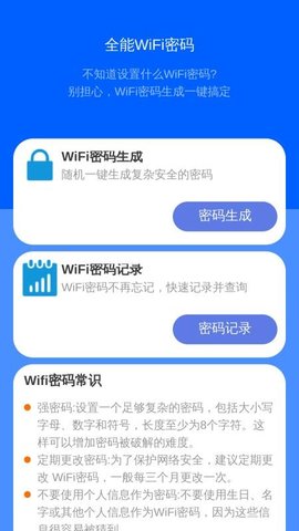 密码生成:提供随机生成复杂安全密码的功能,帮助用户轻松获取高强度的WiFi密码。