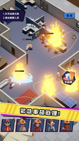 在任务中,可以通过点击相应的按钮,指挥角色进行破门、灭火、救人或搬出财物等操作,灵活应对各种突发状况。