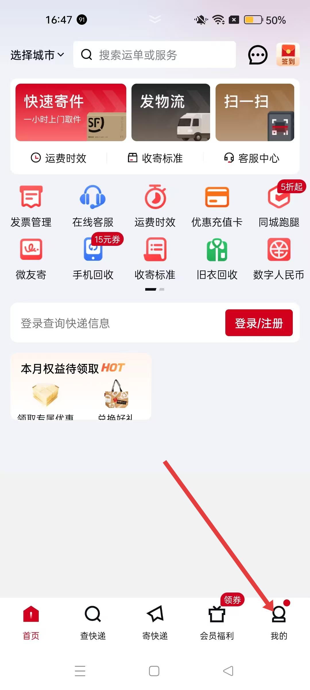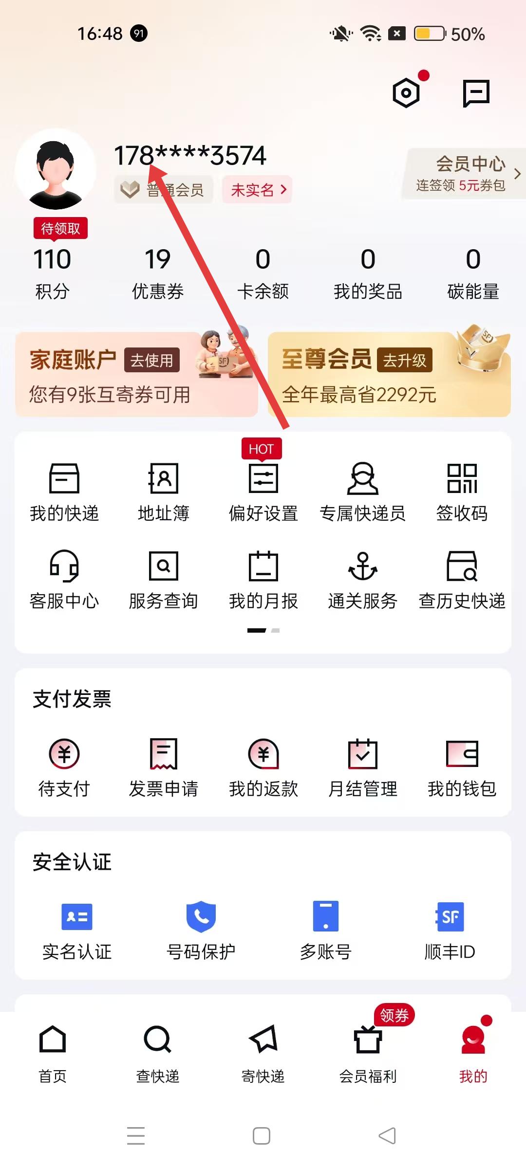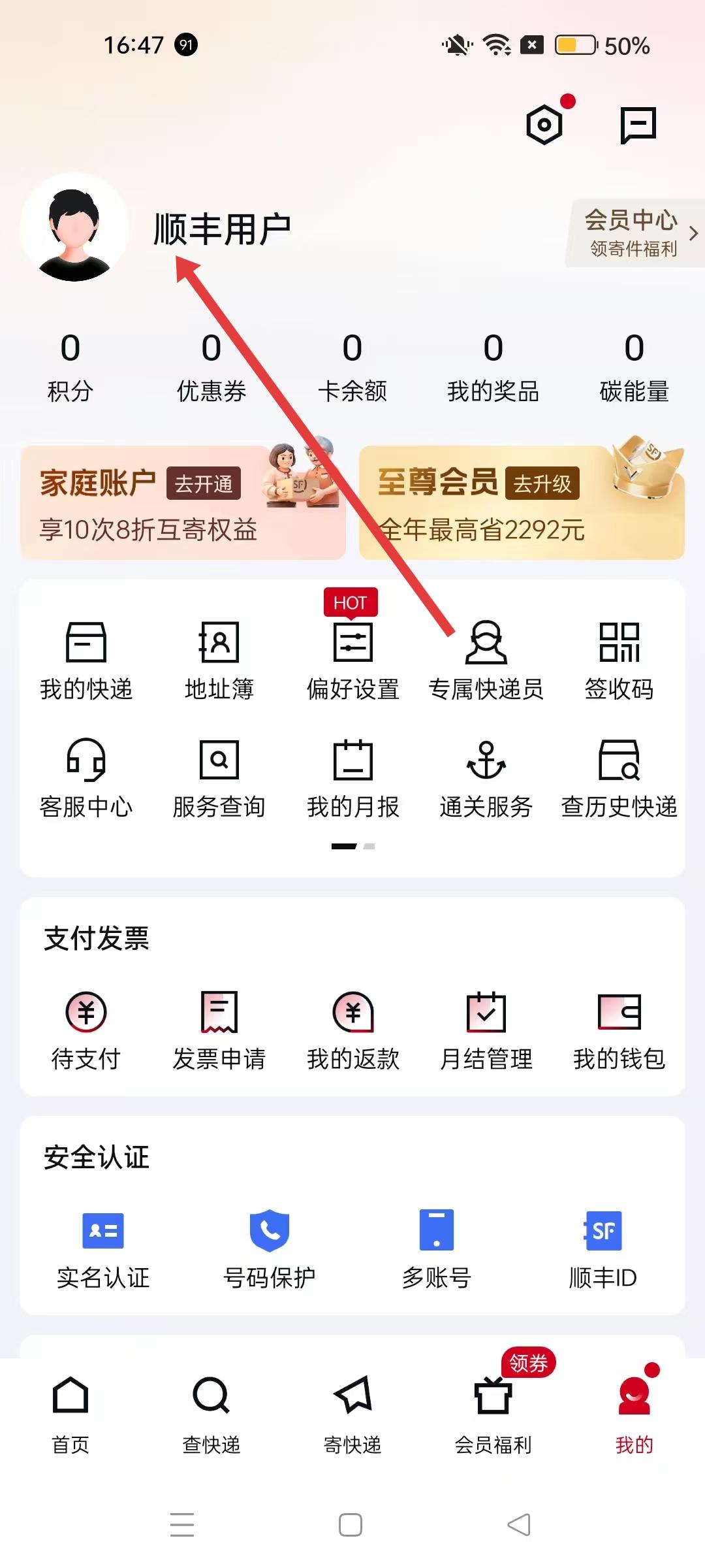 打开顺丰APP首页,点击右下角【我的】按钮,即可进入个人中心界面,进行账号管理及功能操作。
