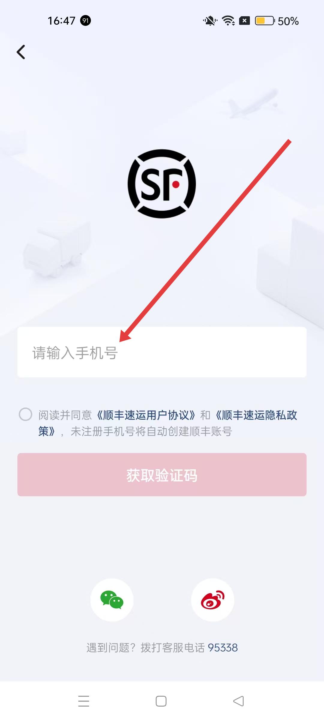 在个人中心界面中,选择顺丰用户区域,按照提示进行账号登录或注册。用户需输入手机号,并阅读相关协议,获取验证码以完成注册或登录。