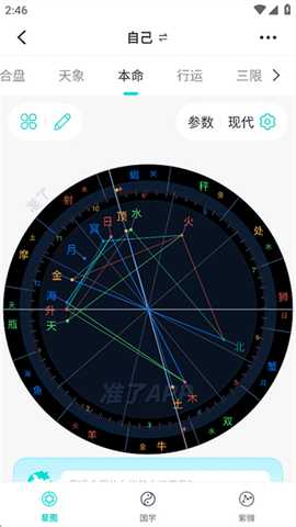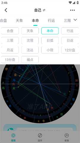 进入星盘设置界面,选择不同占卜模式(如本命盘、合盘)。