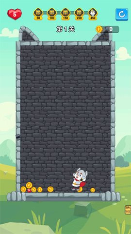 在第一关,需要点击屏幕将左侧的棍子移动,确保钻石和金币能够掉落到小猫身上,从而顺利过关。
