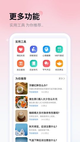 用户还可以点击实用工具,进行人格测试、历史上的今天、心理健康、吉时查询等多种操作。