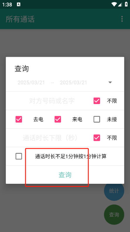 在软件首页,点击查询按钮,设定相关条件后,系统会自动展示符合条件的通话记录,方便用户查看。