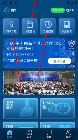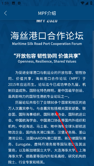 1、打开MPF论坛APP首页,点击MPF介绍按钮,可查看海丝港口合作论坛的相关背景与发展历程。