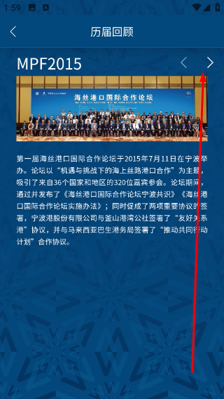 3、点击历届回顾按钮可查看往届论坛的信息,点击箭头切换年份了解各届论坛详情。