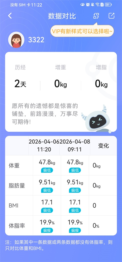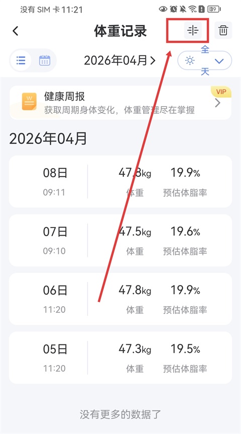 2、进入体重记录页面后,点击「体重记录」字样旁边的图标,进入对比界面;