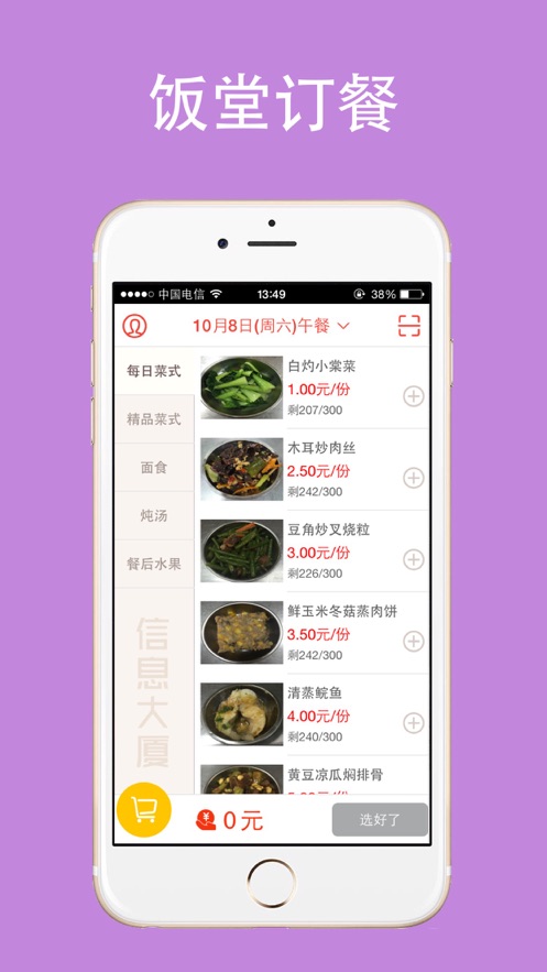 接下来,浏览每日更新的菜品,选择自己喜欢的餐品并加入购物车,确认无误后进行结算。