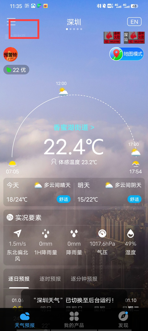 1、进入软件首页,我们可以看到详细天气信息,点击左上角的预警铃;