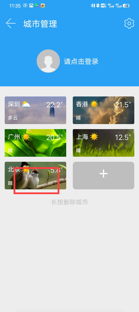 2、我们选择一个城市,点击长按;