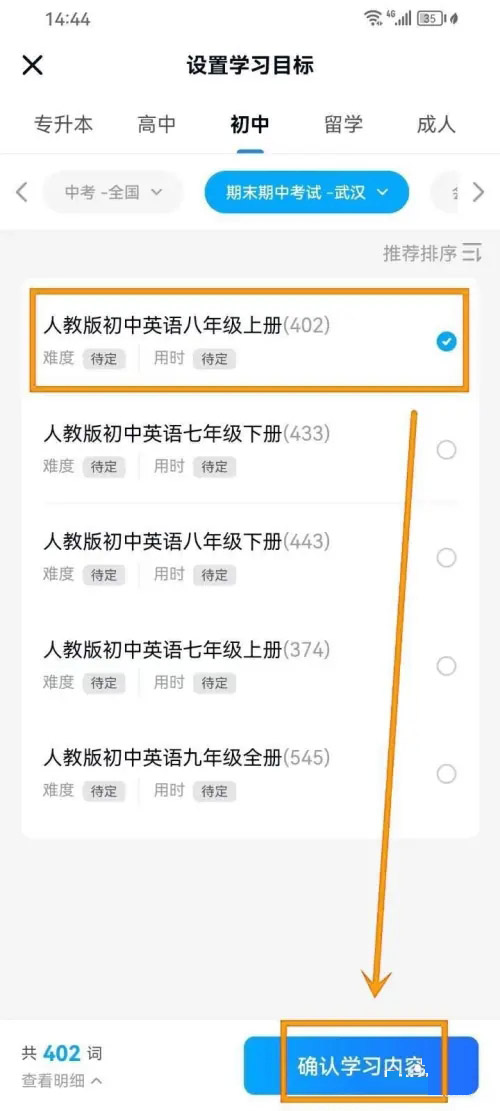 在词书列表中挑选好需要更换的词书,最后点击【确认学习内容】即可完成更换。