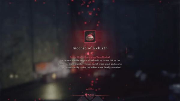 有些物品能治愈你,有些物品会给你增益效果,比如提高防御力或在一段时间内造成更多伤害。有一种物品叫重生的香,如果你在战斗中死亡,它能让你复活一次,你一次只能携带一个。