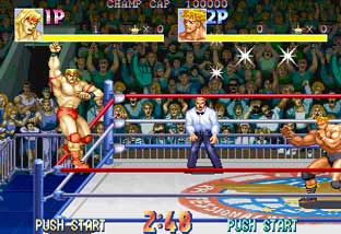 操作:将对手逼至擂台边柱时,按 ↑↑(跳跃)+ A键 爬上边柱,再按 A键 抓住对手头部。