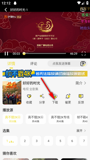 1、进入软件之后,任意播放一部电视剧,点击【下载】