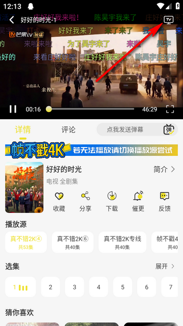 2、接着任意选择一部电视剧播放,这里小编以【好好的时光】为例,点击播放界面右上角的【tv】标志