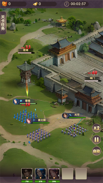 点击战场右下方的自动按钮后,将开启自动战斗,所有武将将自动索敌进行战斗,并在战意值满之后自动释放技能。