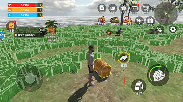 4、当角色靠近物品,屏幕中心会出现一个“拿取”按钮,点击即可打开对应的物品或者直接放到背包