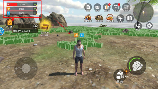 3、左上角是人物状态,红色是生命值、黄色是饥饿值、蓝色是水分,保持每日所需才可以进行其他活动