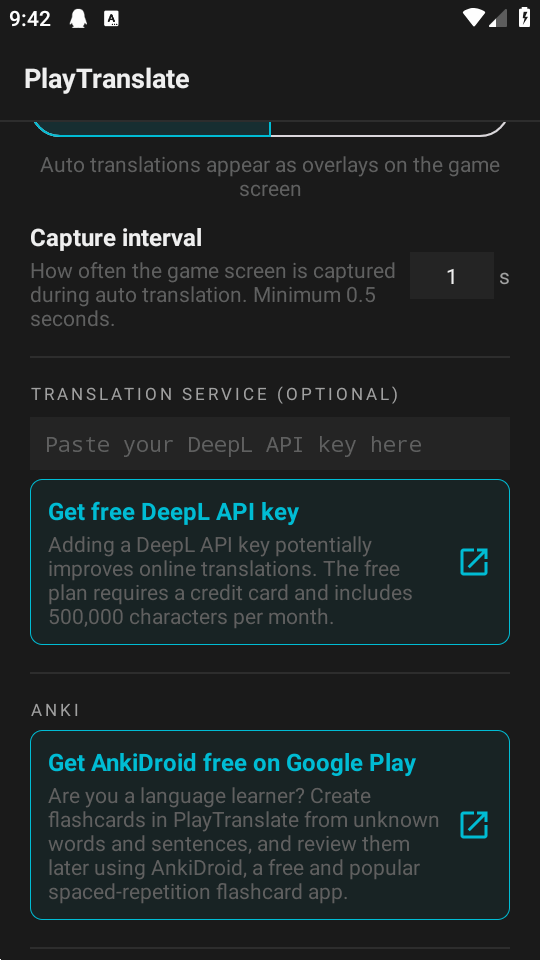 访问deepl.com,注册并申请免费API密钥。获取后,将密钥输入到PlayTranslate的设置中,以启用更高质量的翻译功能。