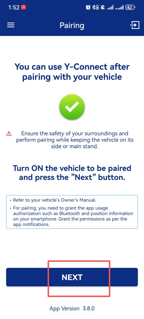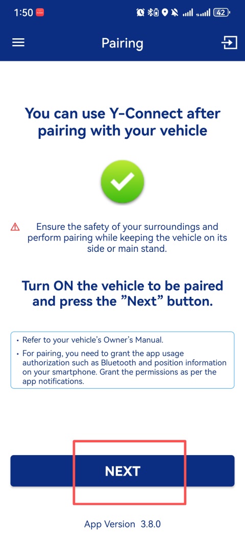 1、打开你的雅马哈摩托车,点击App中的【NEXT】按钮,开始配对过程;