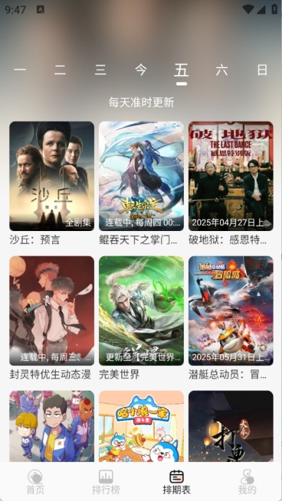 排期表:提供每日影视更新情况,让用户随时掌握最新动态,确保不遗漏任何精彩剧集。