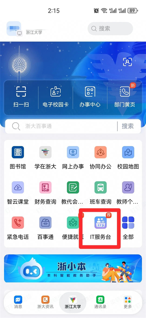 登录浙江大学工作台:进入“浙大钉”App,点击底部中间栏目,首次登陆会跳转浙江大学统一身份认证登录页面,请使用浙江大学统一身份认证用户名和初始密码登录,如未出现,点击左上角箭头位置切换至“浙江大学”。