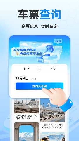火车高铁一键查是一款专注于铁路出行的手机软件,为用户提供便捷而全面的票务信息查询与管理服务。通过软件,轻松规划火车和高铁出行,快速获取所需的车票信息。无论是日常通勤还是长途旅行,火车高铁一键查都能帮助你简化出行流程,享受更加高效的出行体验。