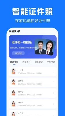 一键更换背景颜色的功能,可以快速调整证件照的背景,满足普通寸照、财务会计、学历考试等多种场景的要求,方便又高效。
