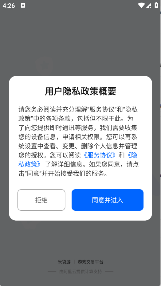 1、在本站下载米袋游App后,打开应用并点击“同意”按钮。