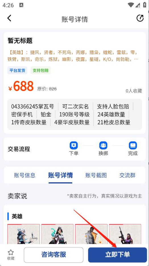 选择心仪的账号后,点击立即下单,完成交易流程即可,整个过程清晰明了。