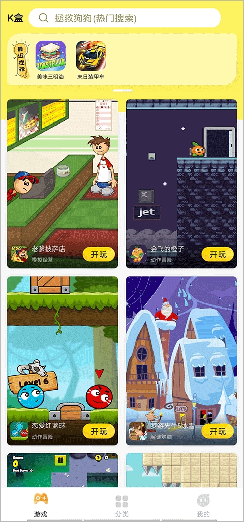 2、分类页面覆盖了各种类型的游戏,总能找到你喜欢的。也支持直接搜索想要游玩的游戏名称。