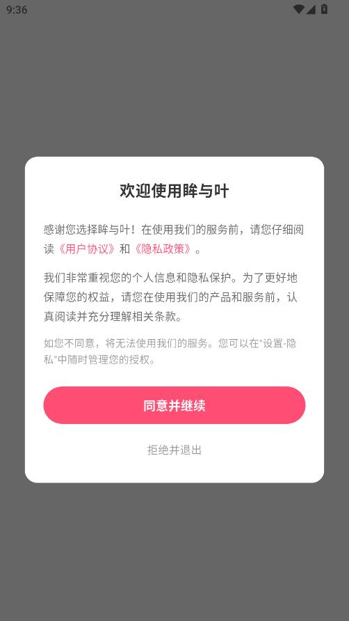 在本站下载眸与叶软件后,首先打开软件,阅读服务协议并点击同意继续。