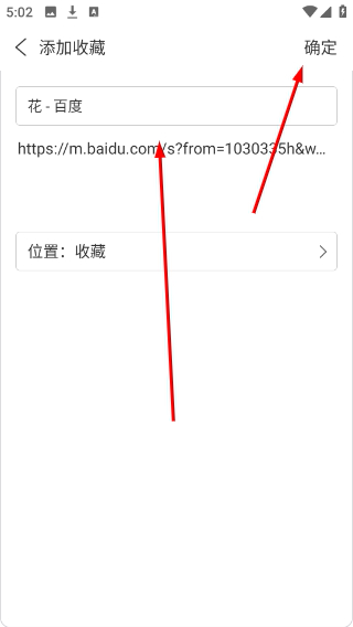 4. 在添加收藏页面确认名称和链接无误后,点击右上角的“确定”即可完成页面收藏。