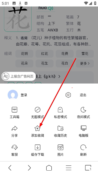 3. 点击底部的菜单按钮,在弹出的功能栏中选择“添加收藏”选项,准备保存当前页面。