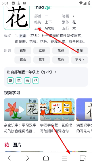 2. 在搜索结果页面可以查看汉字的拼音、部首、笔画等详细信息,还可以观看学习视频。