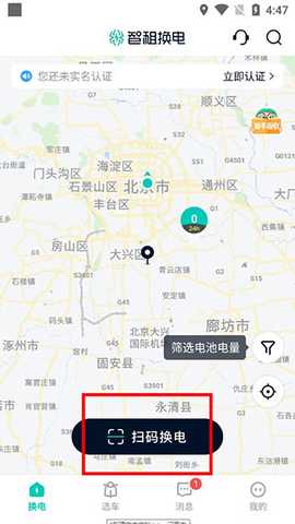 4. 扫一扫进行换电到达换电柜后,打开APP,点击“换电”功能,使用手机扫一扫换电柜上的二维码。