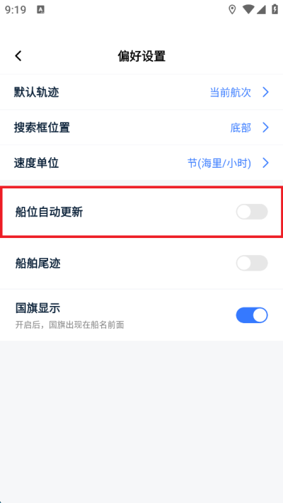 在设置界面中继续点击偏好设置,接着找到船位自动更新这一项,把右侧的开关从灰色点成蓝色,这样自动更新就打开成功了。