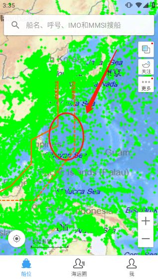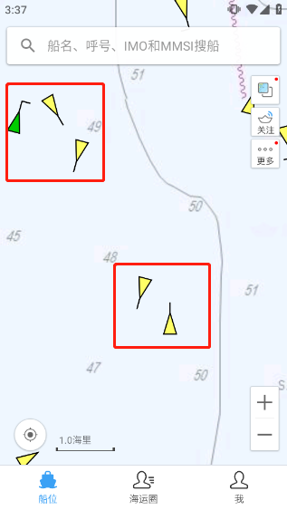 放大到一定比例后,当前海域里的船舶就会以黄色或绿色三角图标出现在地图上。
