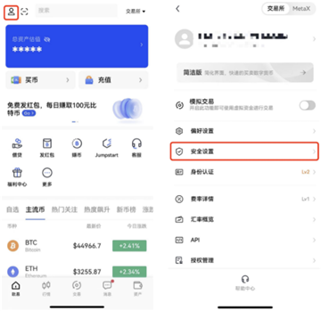 1.打开欧易APP,点击页面左上角【个人中心】—选择【安全设置】,进入安全设置页面。