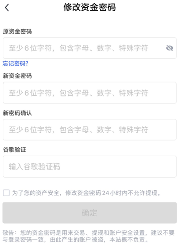 为了您的资产安全,登录密码和资金密码修改或重置后,都会触发24小时提币限制,建议您谨慎操作。