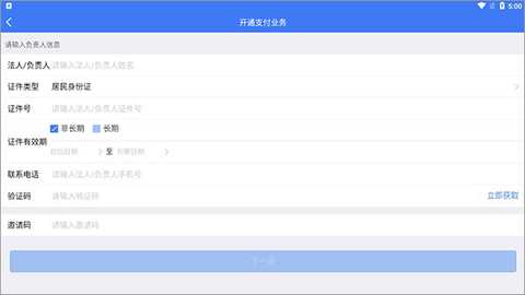 3、依次输入法人/负责人、证件类型、证件号、证件有效期、练习电话、验证码和邀请码:
